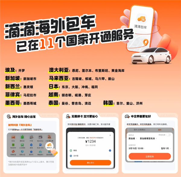 目前滴滴海外包车已上线韩国、日本、新加坡、泰国、马来西亚、澳大利亚、越南、菲律宾、埃及、新西兰、墨西哥共11个国家。