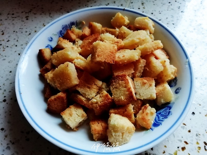 3:面包干倒入,拌匀。