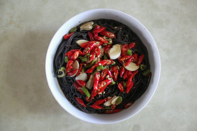 4:调凉拌汁。鲜酱油1勺、醋3勺、辣椒油2勺、麻油适量