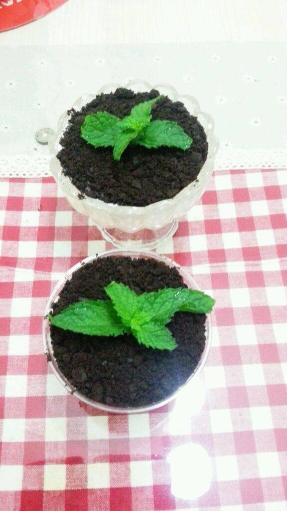4:在酸奶表面铺一层饼干碎,插上一株薄荷叶点缀。