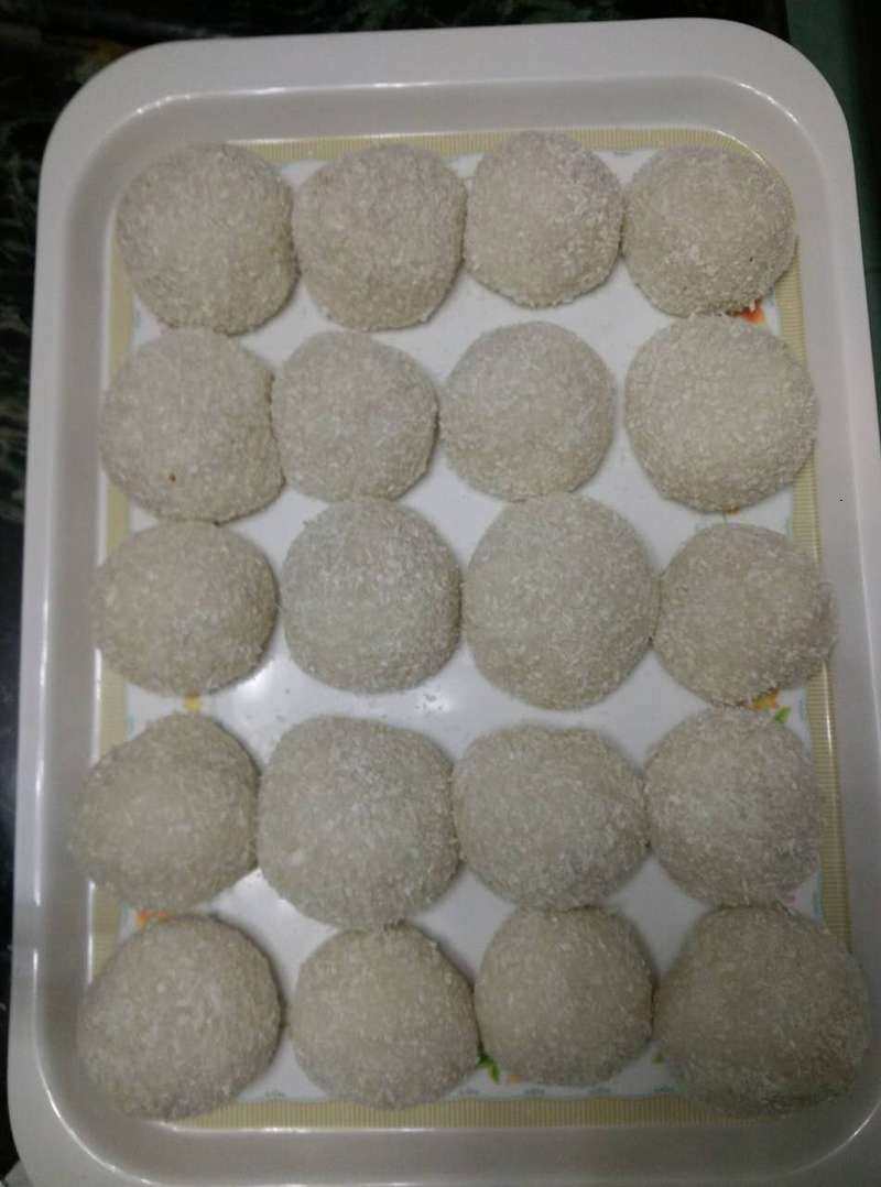 6:分每个25克的小面团,正反面粘上椰蓉