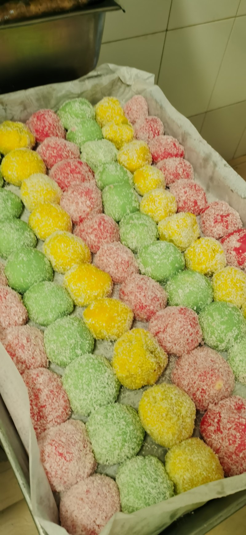 10:椰蓉在不粘烤盘上铺开,没有的话可以用平底锅,防粘效果一样,不放椰蓉的话可以用炒熟的糯米粉代替,
