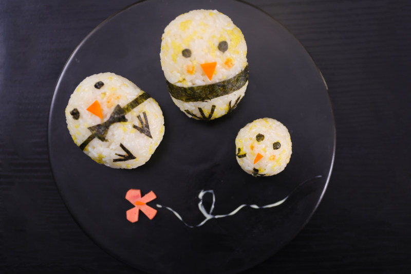 6:保鲜膜铺上米饭,铺上火腿肠和鸡蛋片。
