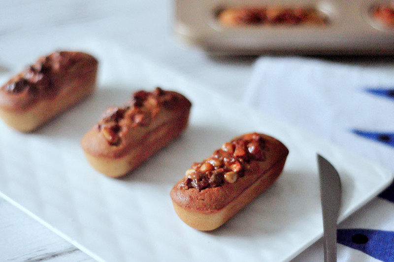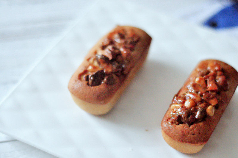 7:将面糊倒入模具,或者装入裱花袋中挤入模具,轻轻震出大气泡,在面糊中间铺上坚果,一字排开,放入预热好的烤箱,175度25分钟左右即可。