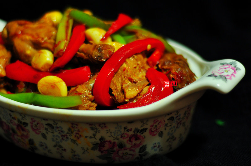 6:辅料:加入青椒红椒中火煸炒,在加入少许水浸辣味,大火收汁,起锅。