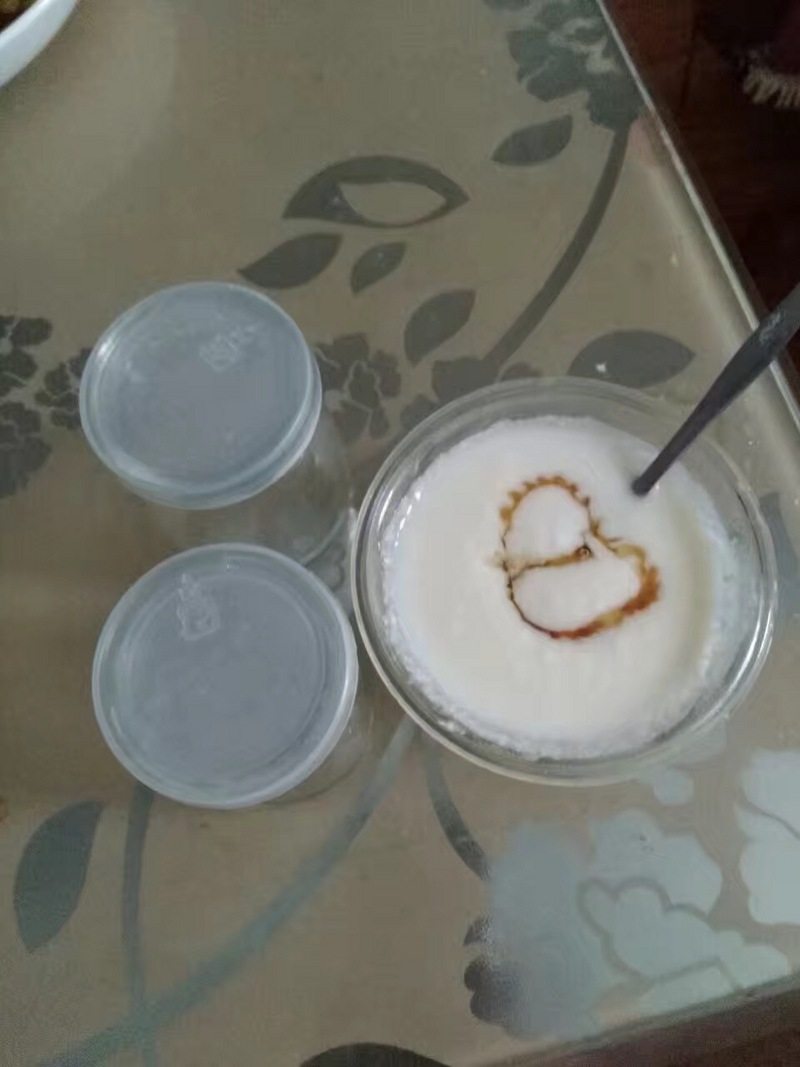 2:牛奶放入干净无水的容器中,加入适量白糖,置于炉上小火加热至40度,停火,移出,放至不烫手,放入菌粉,并不断搅拌均匀