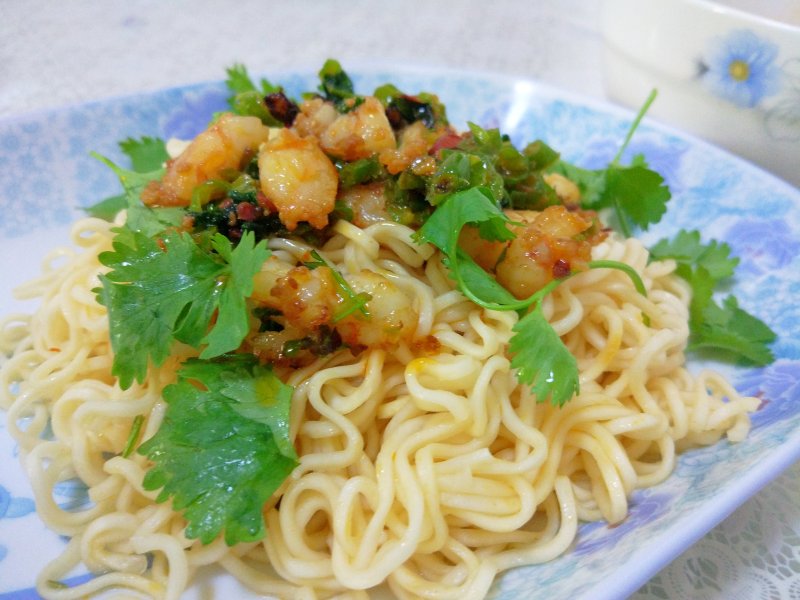 3:烧开水,将泡面泡3分钟,泡面捞出放盘子里。虾仁下锅炒熟,摆在泡面旁边,泡面上放少许炒熟的虾仁,香菜等。