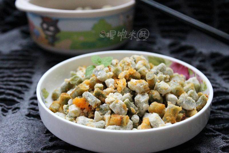 9:拌匀,蒸锅水烧开。蒸笼铺笼布,把拌好的豇豆麦饭倒上,大火蒸10-13分钟即可。
