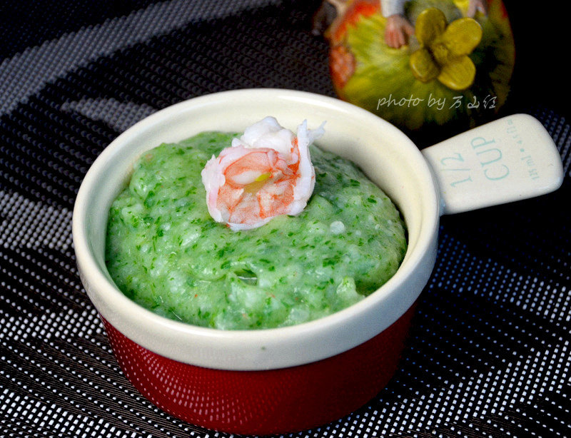 9:做好的土豆泥,翠绿的蔬菜,鲜嫩的虾仁,尽快没有放盐,但味道依然很好的哦,小宝宝可喜欢啦,这样的小碗能吃两碗哩