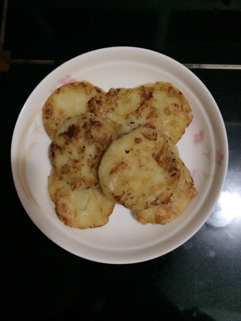 4:土豆蒸熟出锅,用勺子压成泥,不要过碎,有些小块,口感好,加入调料和适量面粉,抓匀。在干案板上倒些玉米淀粉,蘸手后抓土豆泥,团成饼状。