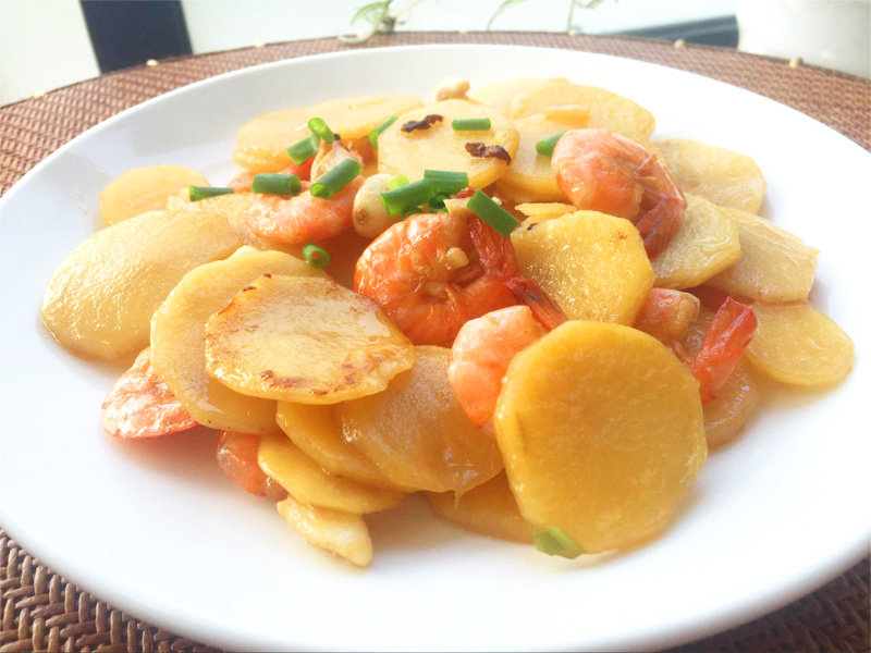 12:加入煎好的大虾,拌匀;再加入煎好的土豆,完成