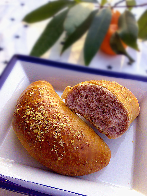 高筋粉270克;紫薯泥50克;盐2克;糖40克;水60克;黄油35克;淡奶油100克;酵母5克;蛋1个;