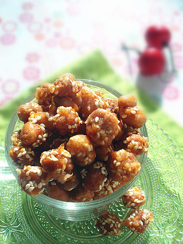 7:白糖炒至发红,倒入炸好的花生米翻炒,撒入芝麻,炒匀即可。