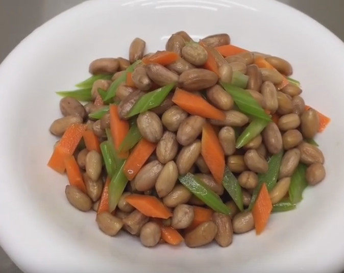 6:花生米放入盘子里,加入萝卜,芹菜,盐,香醋,生抽,香油拌匀即可。