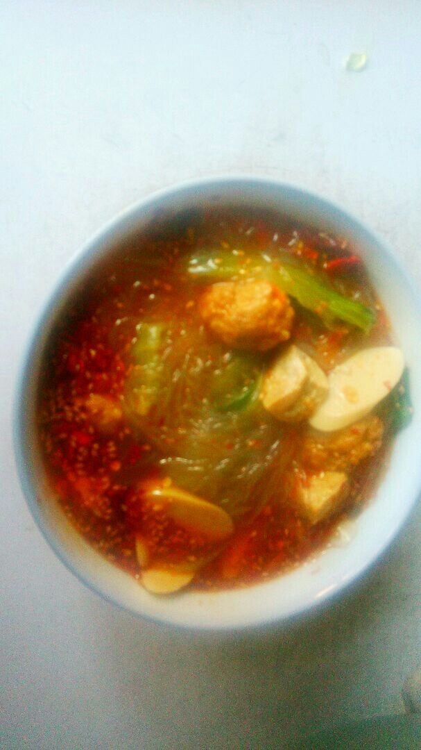 粉丝1个;油菜1棵;丸子4个;豆腐泡4个;鸡肉肠1个;
