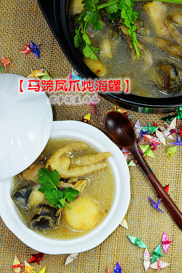 1、三种食材的成熟度不一样,先将鸡爪炖制软烂,再放入海螺炖制,最后放马蹄炖制;2、海螺也可以蒸熟后取肉再炖制,但鲜味不如生的螺肉美味;3、这道菜中间不需要调味,咸淡口感不好掌握,汤炖的最后10分钟时再调味即可。