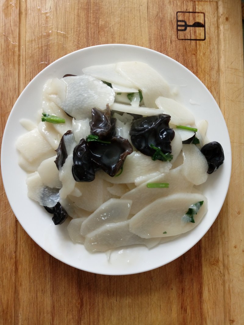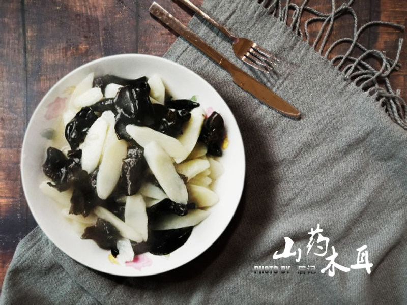 1:山药刨皮切片,可斜着切,看上去大一些,厚度约3~5毫米。木耳用凉水泡发。