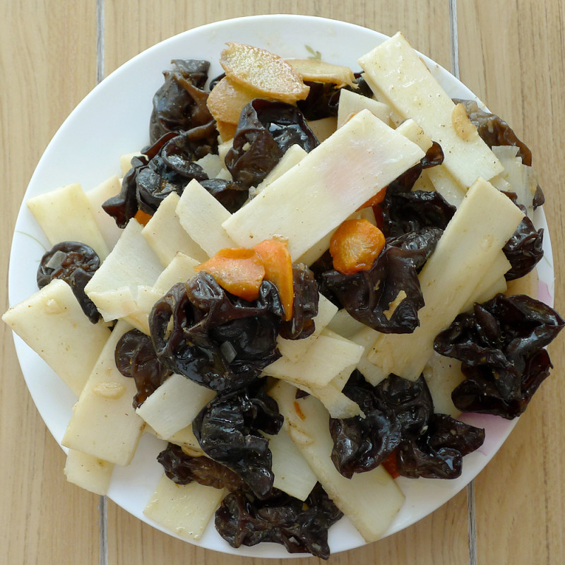 2:木耳洗净杂质,去掉硬根,撕成小朵,冷水下锅,煮至变软。水中可加点盐同煮(配方外)。