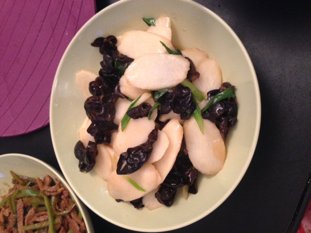 3:起油锅,油热下木耳、山药翻炒,加盐、糖炒匀。