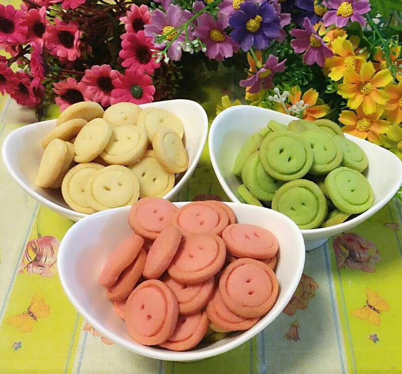 10:不同颜色的纽扣饼干已做好。