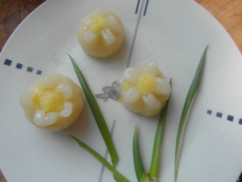 7:用小勺柄在收口处塑出花瓣的形状,花朵奶黄包就做好了。