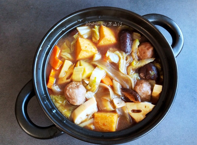 鱼豆腐200G;牛肉丸子200g;胡萝卜半根;土豆1个;莲藕1节;香菇干30g;白菜200g;