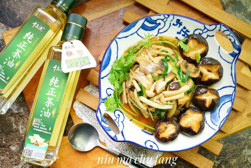 1:备好所用食材,我用到了各种菌子食材,。小苹菇,香菇,金针菇,口磨,白玉菇,再就是友友送的千岛源茶油。