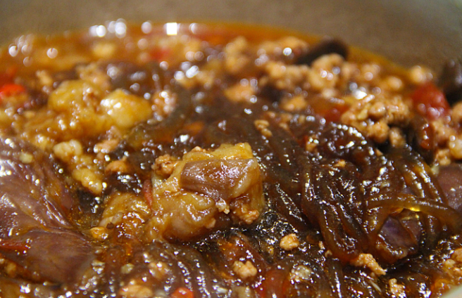 3:肉炒至微黄,加入剁碎的姜,大蒜,加茄子翻炒,最后加入洋葱,大葱!