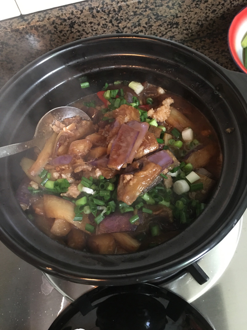 10:将茄子盛到砂锅里,开小火焖一会。放入葱花