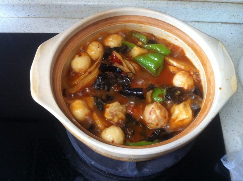 7:放入土豆片,鱼丸,木耳,以及两勺豆瓣酱。加水煮熟。
