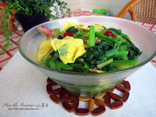 10:临出锅时放上切好的鸡蛋块,鸡精调味装盘。