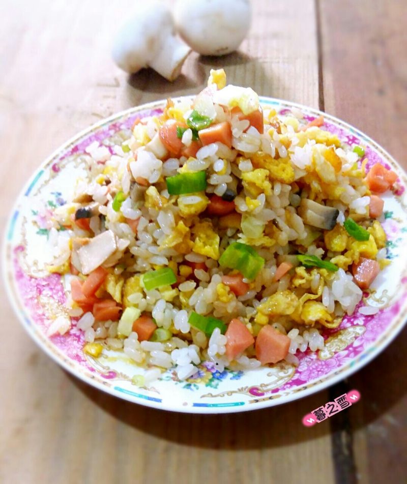 蘑菇2个;鸡蛋1个;火腿肠适量;米饭适量;