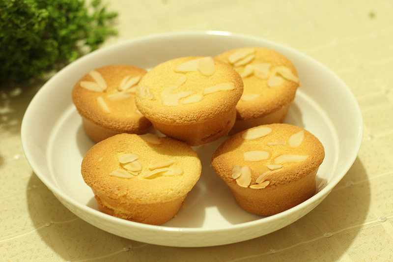 3:将混合好的蛋糕糊倒入模具,用手端住模具用力在桌上震动两下,把气泡震出来,撒上巴旦木切片,放进预热好的烤箱,170度,上下火,放烤箱中下层,40至50分钟