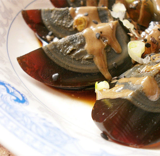 4:切皮蛋,半盘,加入调料汁,淋上麻酱,撒上葱花。
