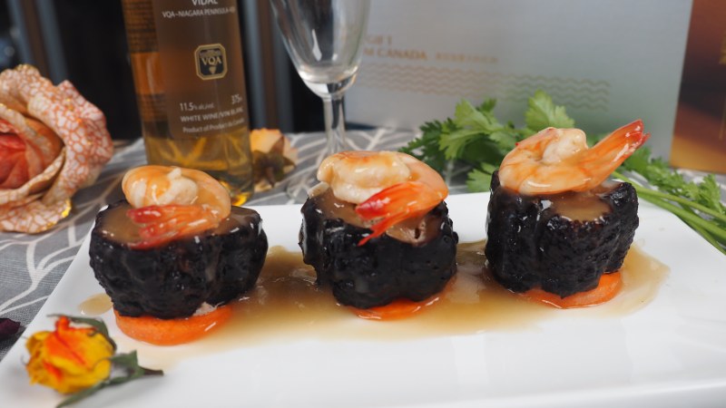 2:海参切成圆柱体,将肉馅填满海参肚里,和虾仁一起放进蒸锅蒸10分钟。