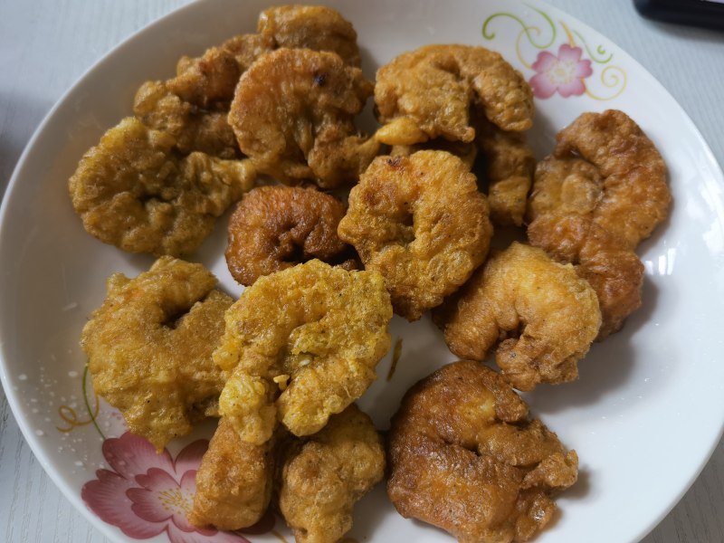 4:把虾裹上面糊放入油锅里炸至微黄捞出。如果觉得虾上的面粉不够可以再裹一遍面糊,复炸。