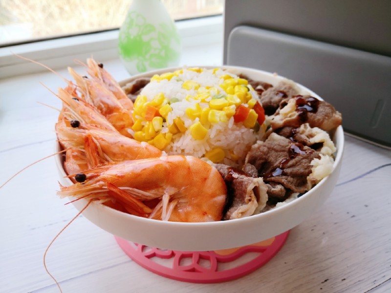 8:用一只干净的碗,把玉米饭盛到碗里,压实再倒扣到盘子里,肥牛和大虾都摆到米饭周围,肥牛上淋上少许的黑胡椒酱,就可以开始品尝了。