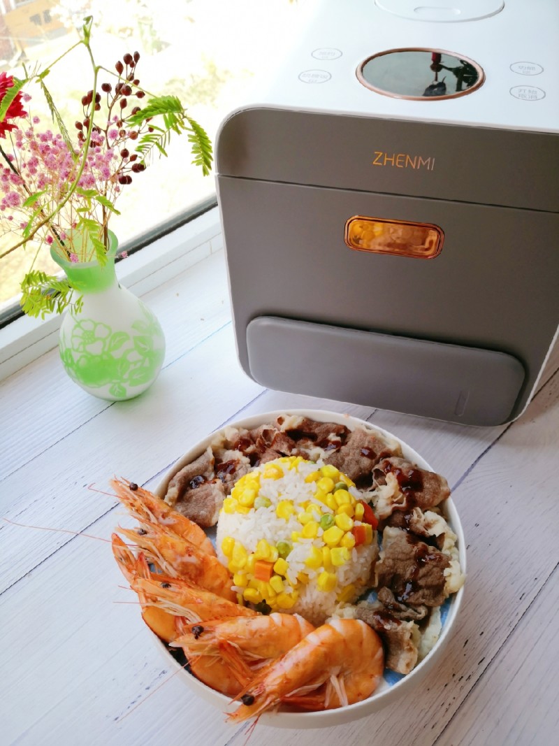 1.米饭里放入玉米粒,加水量按照大米所需要的水量再稍多一点就可以。2.煮大虾和肥牛的时候要注意火候,不要时间长了虾肉和肥牛就会口感发硬,不好吃了。