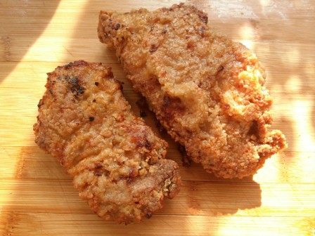6:面粉一份、面包糠一份、淀粉半份,外加两汤匙大蒜粉和一小匙鸡粉,搅拌均匀
