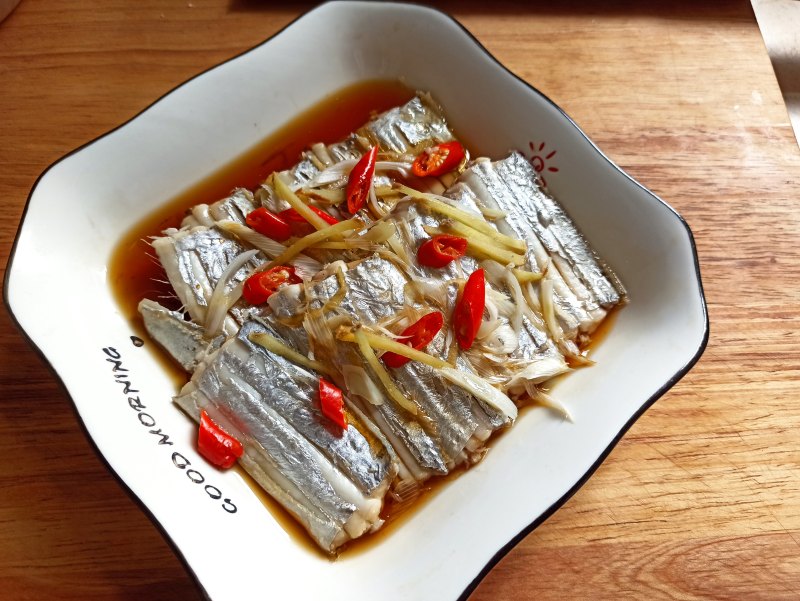 3:用比较整齐的10小段油带用来做清蒸。加入葱姜丝,小米椒,白胡椒粉,料酒,少许盐抓匀腌渍片刻。