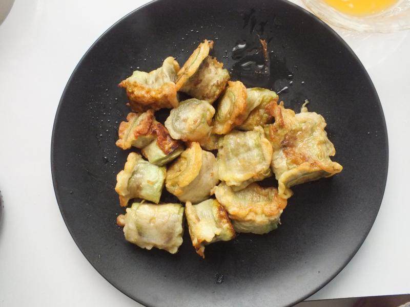 8:茄子吃油,所以做这个不能吝啬油。油锅7成热,调中火放入挂糊的茄盒,用筷子翻动,一面金黄再炸另一面,一个茄盒两分钟足够了,一般一分半就可以的。