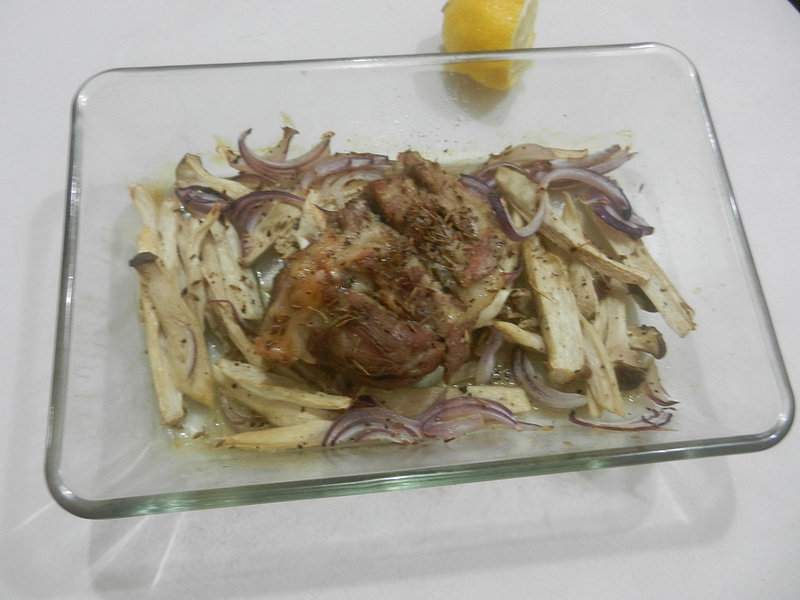 3:将煮熟的羊腿捞出,放入烤盆中,加洋葱、蘑菇、适量橄榄油。烤箱200度,考20分钟