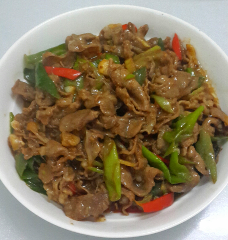 5:见肉变色,加入少量盐,蚝油,豆瓣酱,糖,胡椒粉,翻炒出锅