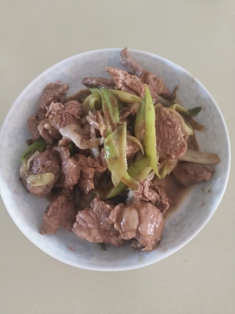 炒菜过程要动作快,急火爆炒才好吃,所以看到羊肉变色就加葱块,加完盐和酱油翻炒几下即可出锅,不要等葱变软,否则就不好吃了。