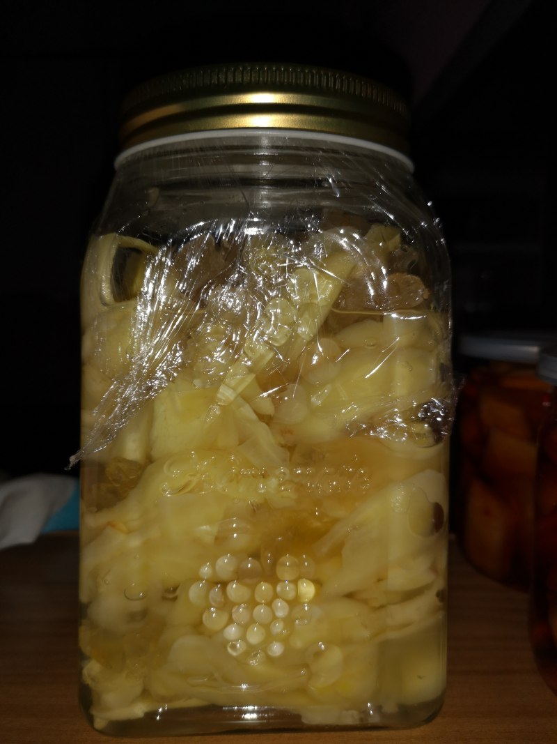 2:拧干水分后,倒干水分,一层姜一层黄冰糖码好,然后倒入少量白酒,再倒醋没过姜片,盖好盖子,放在常温下一天之后放入冰箱冷藏保存。