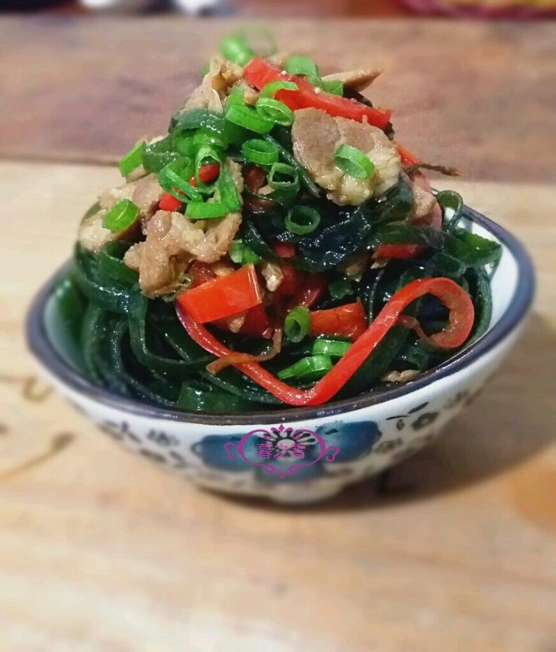 4:依次加入:葱花、肉片、海带。加一些酱油翻炒均匀。