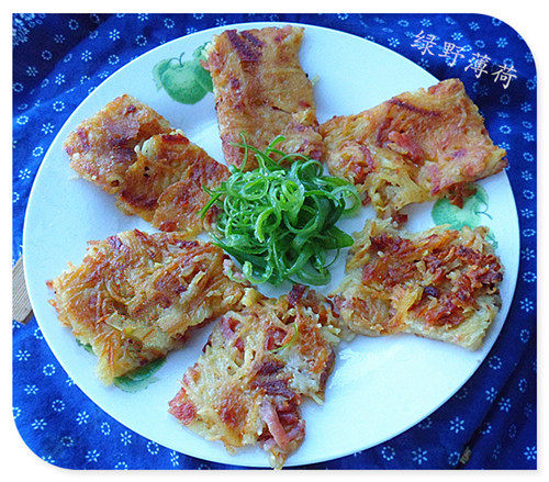 1:土豆,胡萝卜打成丝,火腿切小丁,大葱切碎。
