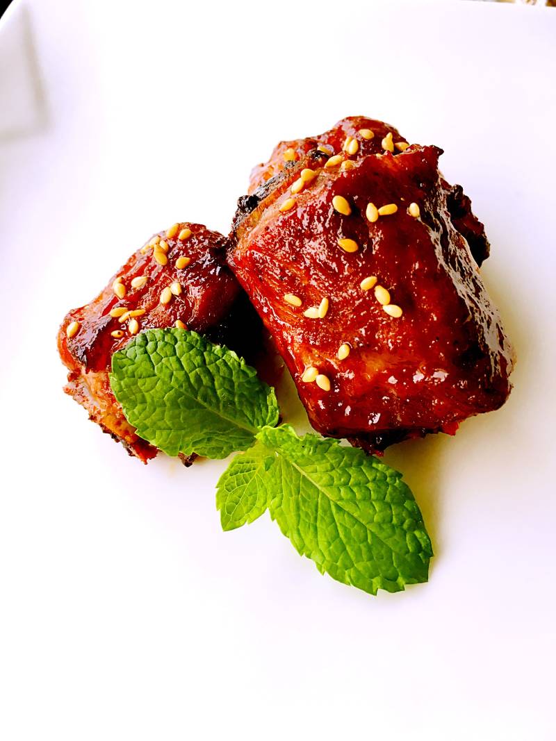 6:中途打开烤箱把排骨翻一遍,刷上腌制酱汁。(喜欢甜的可以刷蜂蜜水)