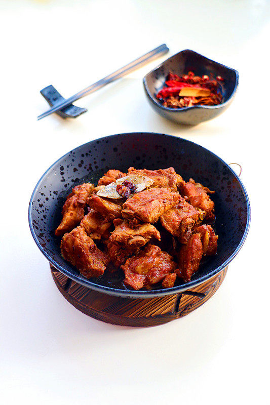 4:加入豆瓣酱继续炒,可少量淋点开水防止沾锅,待酱都均匀挂在排骨上,味吃进肉中加开水没过排骨,先大火烧开转小火炖至汤快收干,加盐糖调味即可。