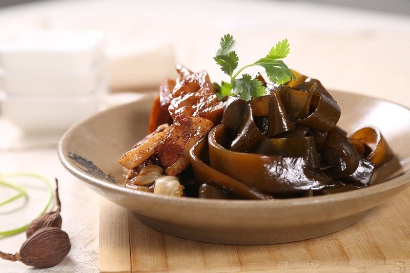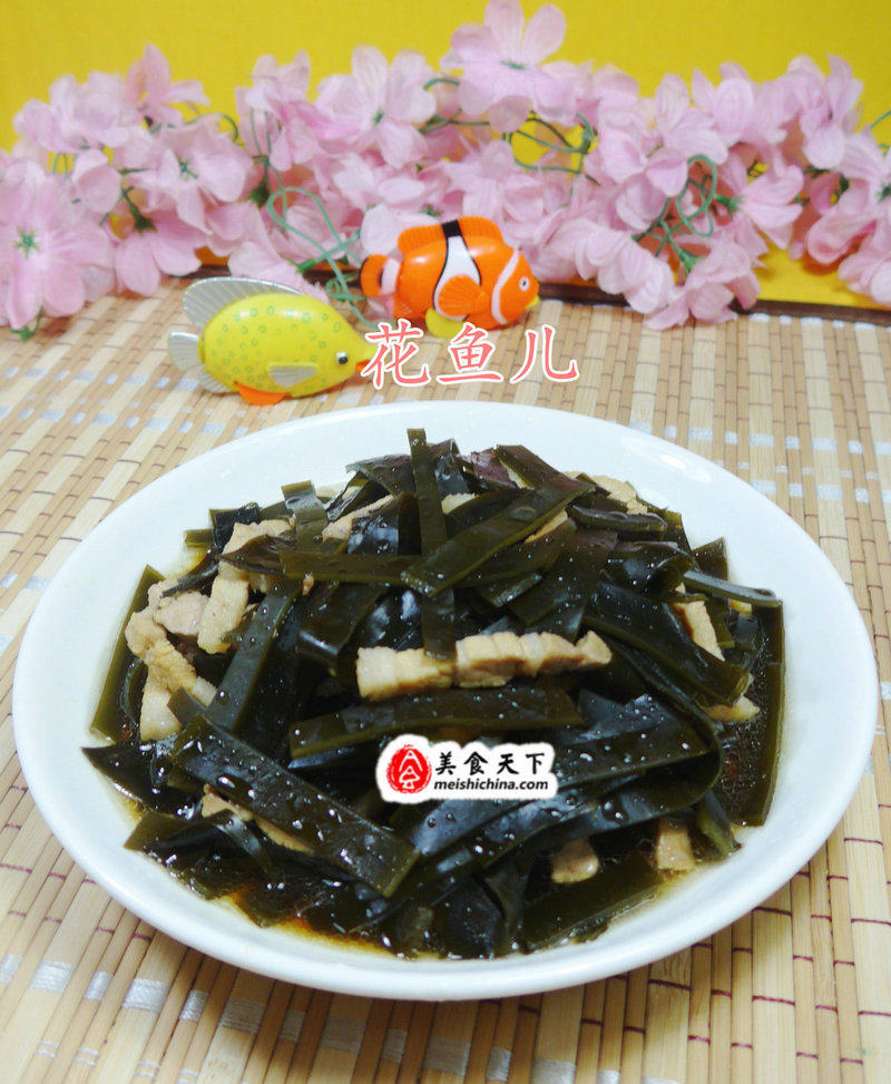 1:食材:海带(已泡发清洗)、熟五花肉(已切丝)